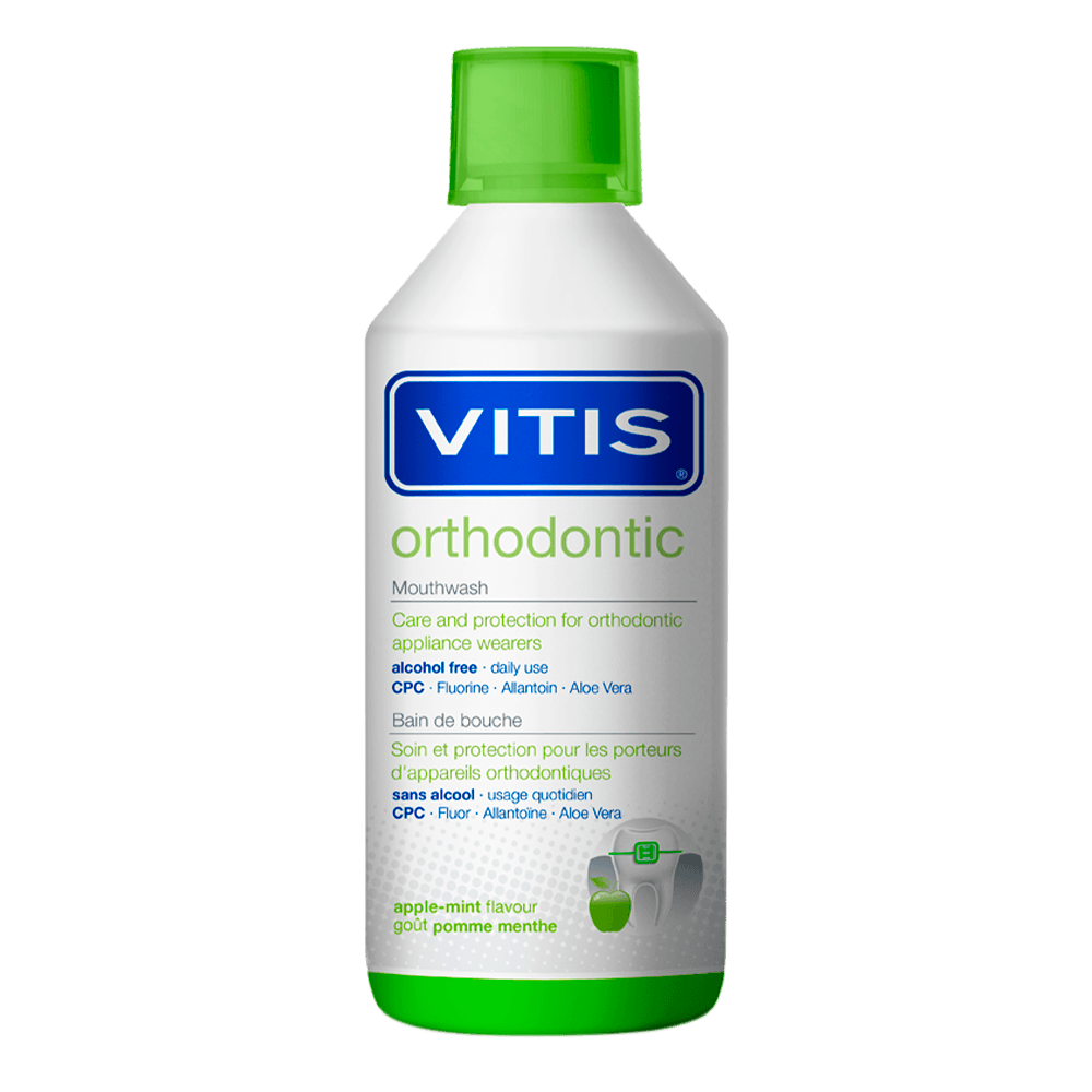 Ополіскувач VITIS ORTHODONTIC містить активні інгредієнти, необхідні для щоденного підтримання здоров’я ротової порожнини. Підсилює дію зубної щітки та пасти, оскільки досягає важкодоступних місць навколо ортодонтичних конструкцій та допомагає активним компонентам довше залишатися в ротовій порожнині.